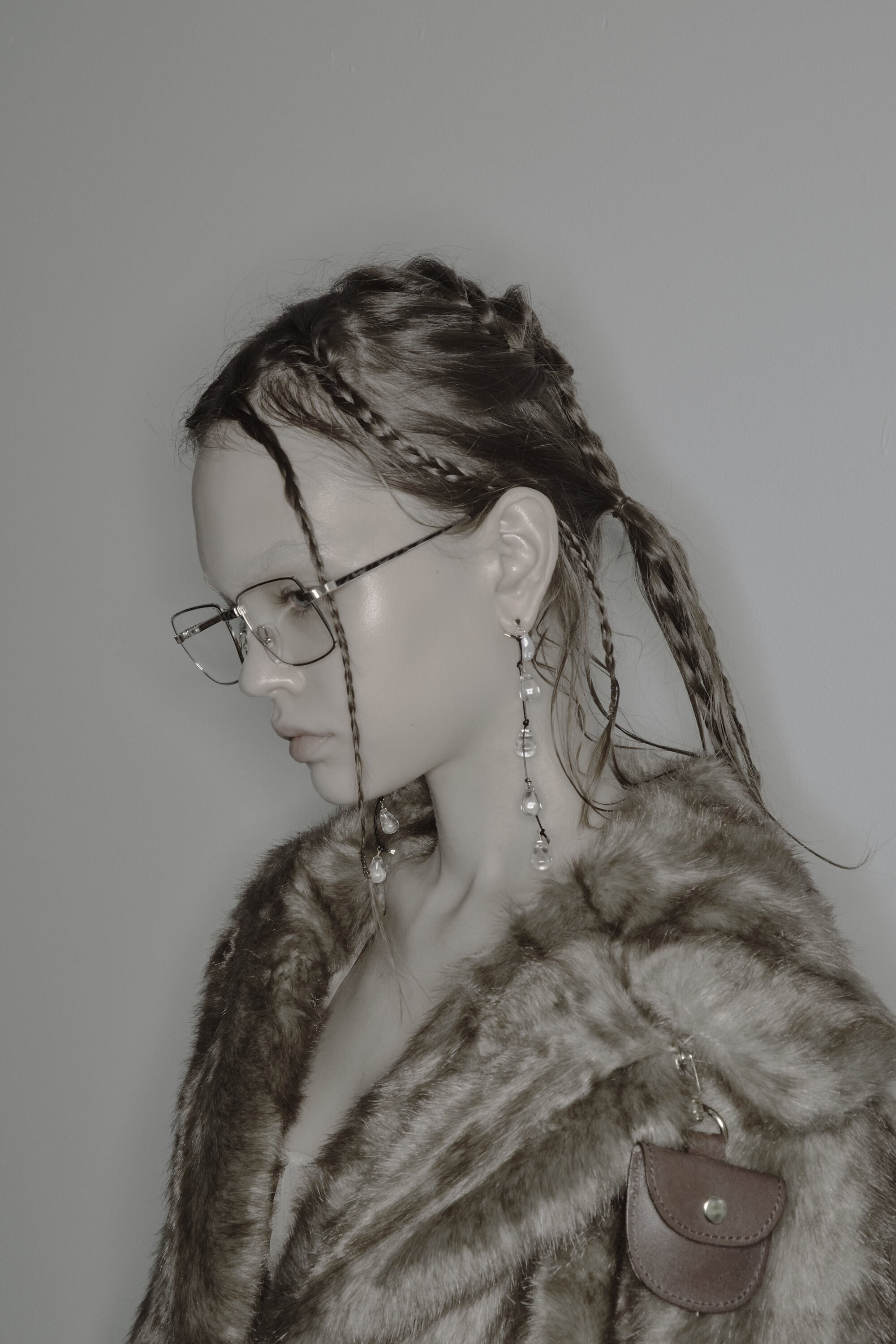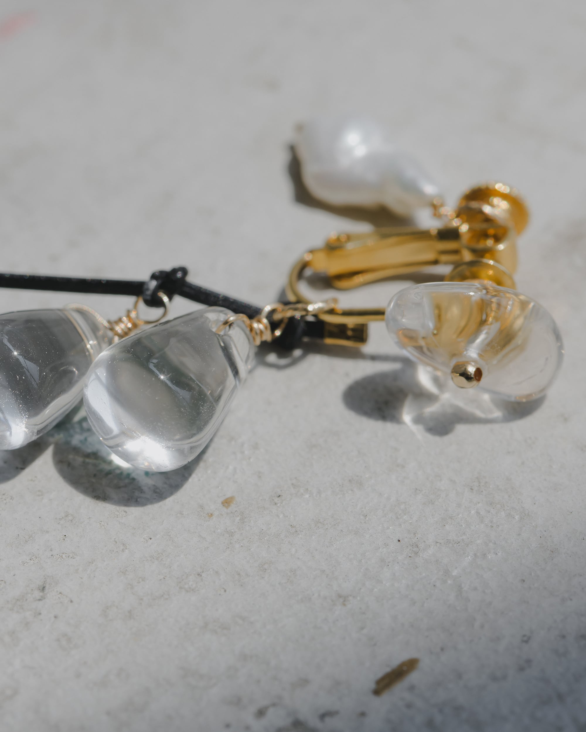レザーコードにドロップシェイプのクリスタルがヴィンテージライクで目を惹くイヤリング。ピアスはハートモチーフのポスト、イヤリングはバロックパールのトップで品よく仕上げました。